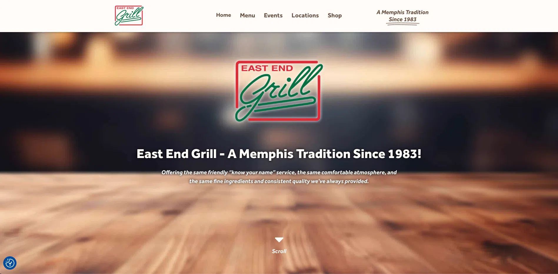 East End Grill is a long-standing Memphis restaurant known for great food, good company, and a welcoming atmosphere. Their old website no longer reflected the quality or personality of the restaurant and made it difficult to keep content up to date. The biggest challenge was updating menus, which required technical help and slowed down changes. They also needed a way to showcase their events and give visitors a reason to return beyond a single visit.