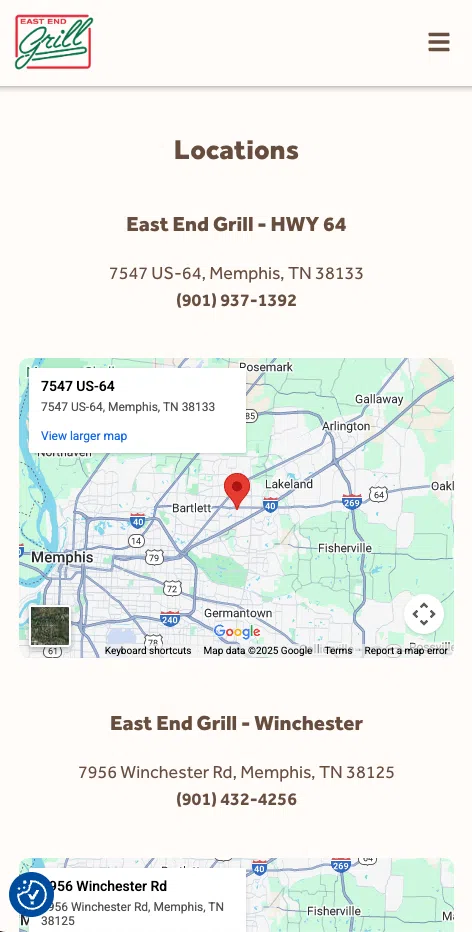 The mobile locations page makes it easy for guests to find and contact their preferred East End Grill. With clickable phone numbers, embedded maps, and a clean layout, visitors can connect quickly while enjoying a warm design that reflects the restaurant’s friendly personality.