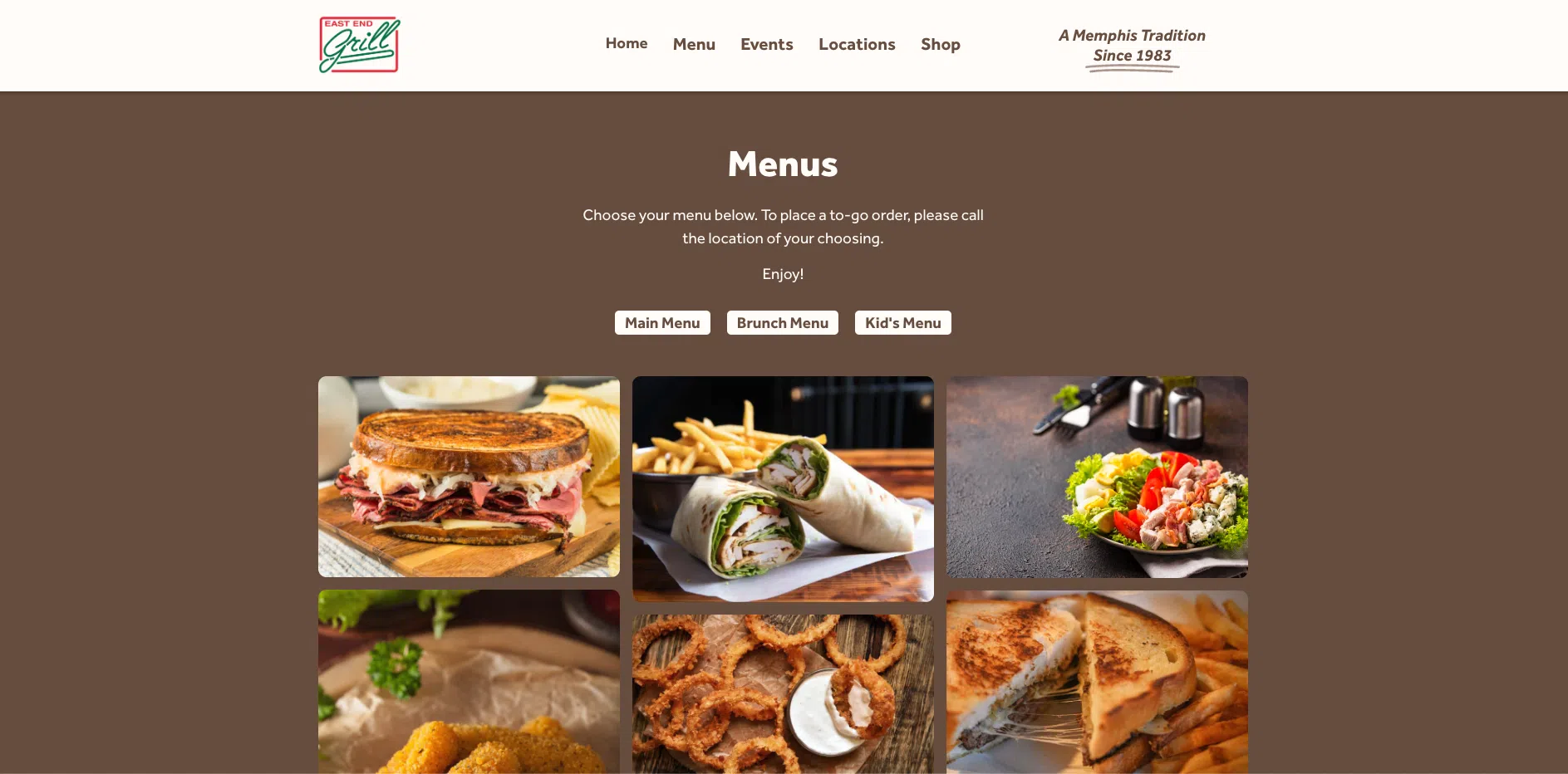 This dynamic menu page for East End Grill highlights the restaurant’s classic offerings through vivid imagery and clear navigation. Guests can explore the main, brunch, or kid’s menu with a single click, creating a seamless online experience that reflects the warmth and flavor of a Memphis dining tradition.