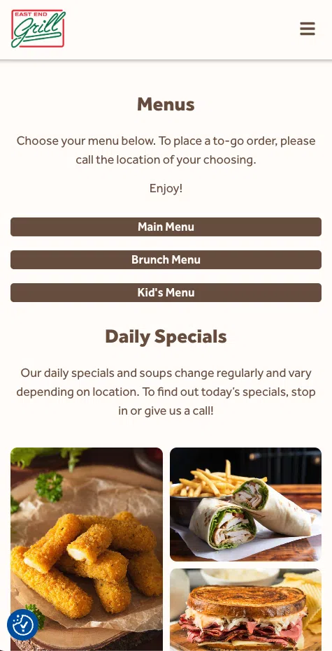 The menus section makes browsing easy and inviting, allowing guests to view main, brunch, and kid’s menus without distraction. A warm color palette and clear layout reflect East End Grill’s family-friendly atmosphere while keeping the dining experience simple and personal.