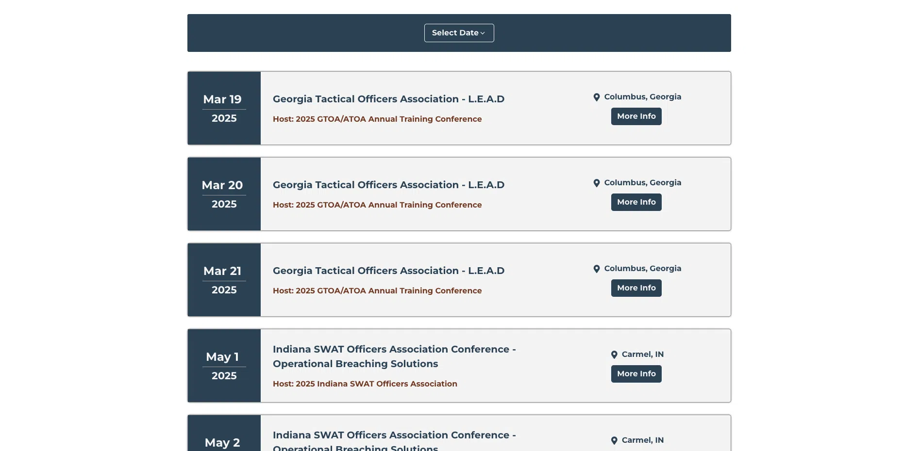 The Community Events Schedule connects Guild Solutions Group with tactical professionals nationwide. Built with dynamic functionality, it allows users to explore events and workshops easily. The design promotes growth, networking, and collaboration within the tactical training community.