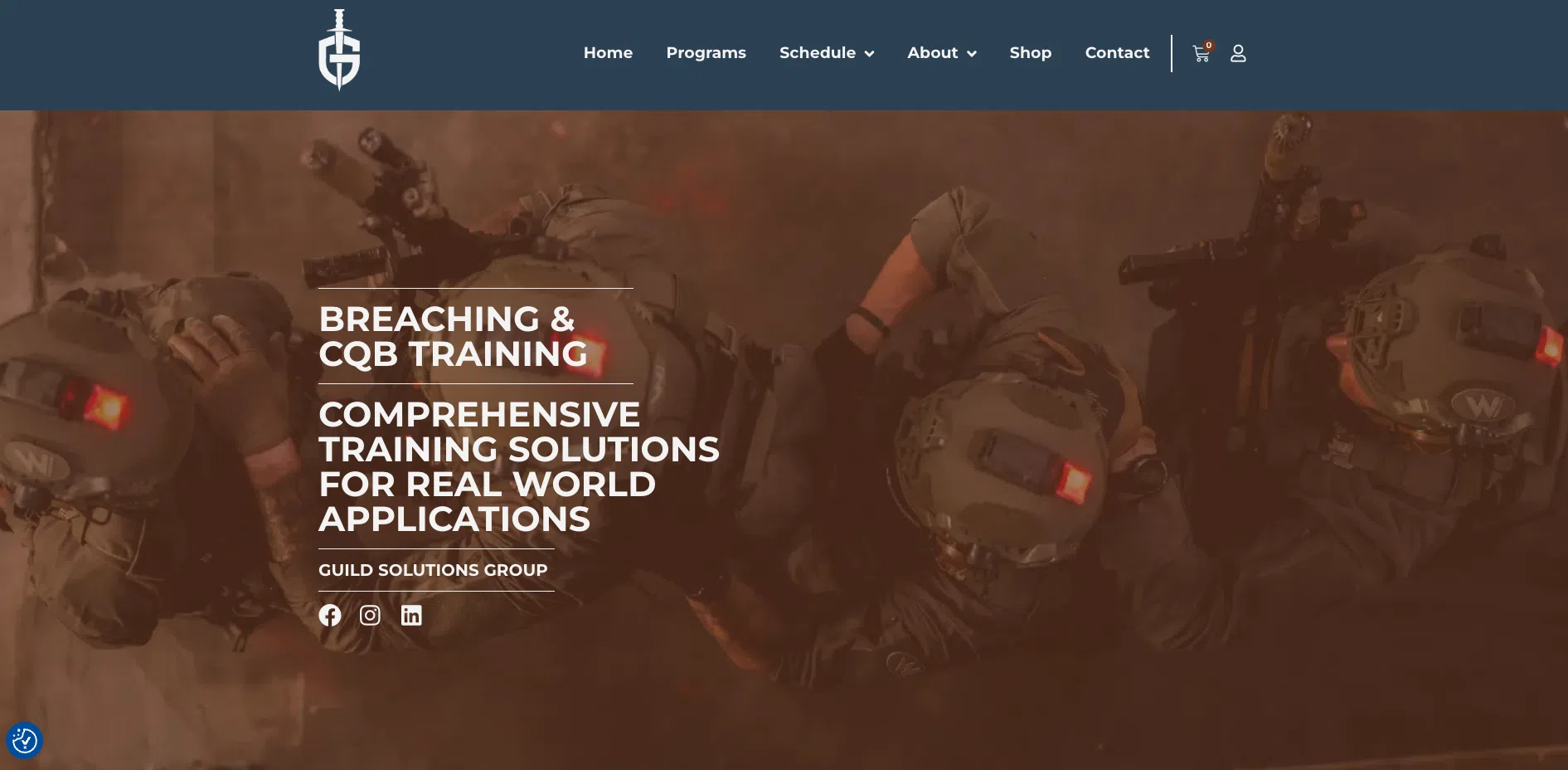 The homepage hero for Guild Solutions Group establishes authority and intensity from the start. Bold typography, tactical imagery, and a dark tone reflect the brand’s expertise in breaching and CQB training. The design immediately communicates strength, professionalism, and real-world application.