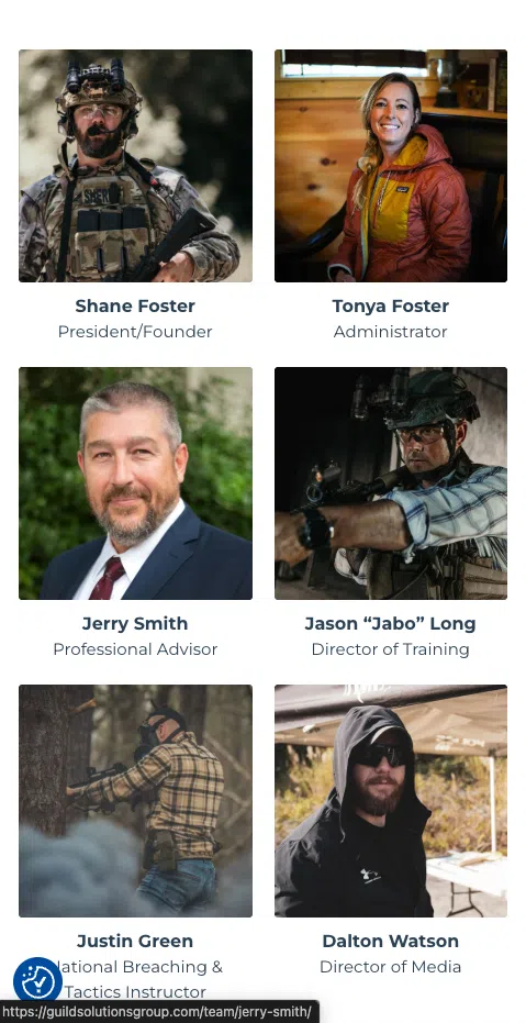Each team member profile is built for accessibility and impact on mobile. The design presents Guild Solutions Group instructors with professionalism and clarity, allowing users to easily learn about their experience and expertise. Clean formatting and strong visuals reinforce trust and authenticity within the tactical training community.