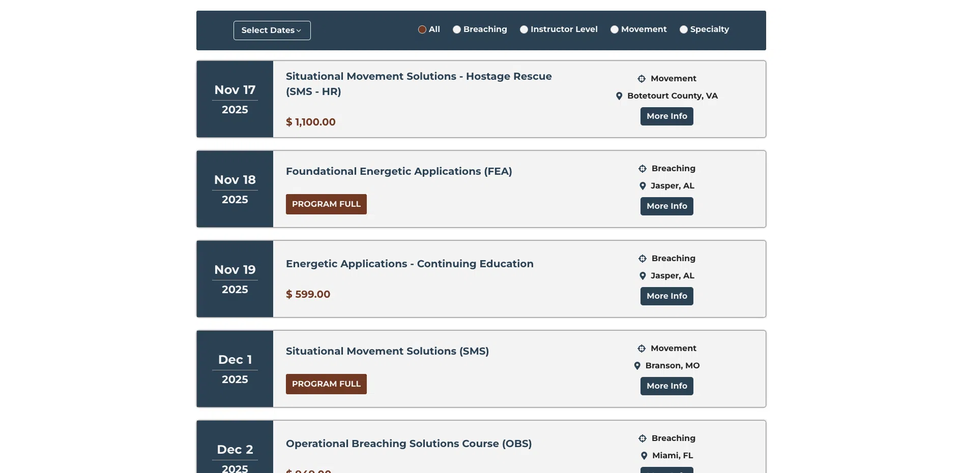 The Training Programs Schedule is the foundation of Guild Solutions Group’s website. Built with dynamic data and expandable content, it allows users to explore complex training categories with clarity. Each section presents advanced tactical programs in an organized, interactive, and professional layout.
