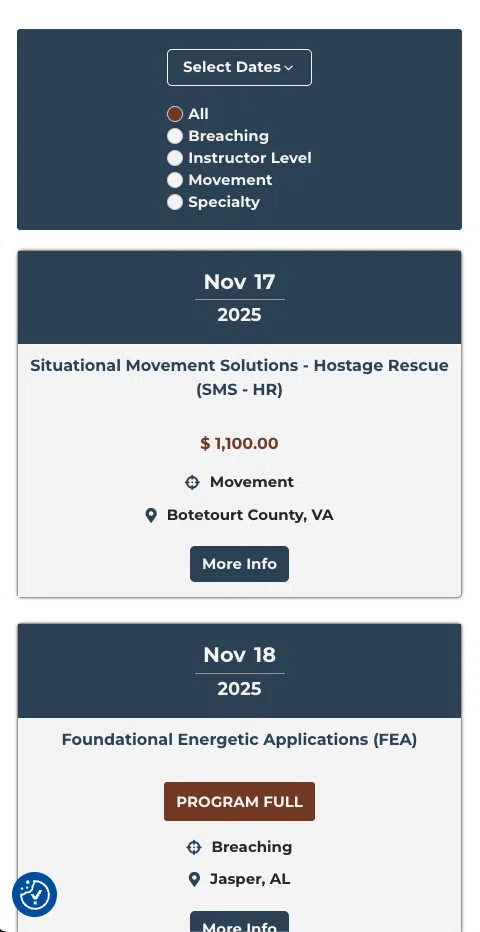 On mobile, the Training Program Schedule maintains full functionality without losing clarity. The streamlined design allows users to filter by category, view pricing, and register with ease. Each element is optimized for fast navigation, ensuring tactical professionals can access critical training anywhere.