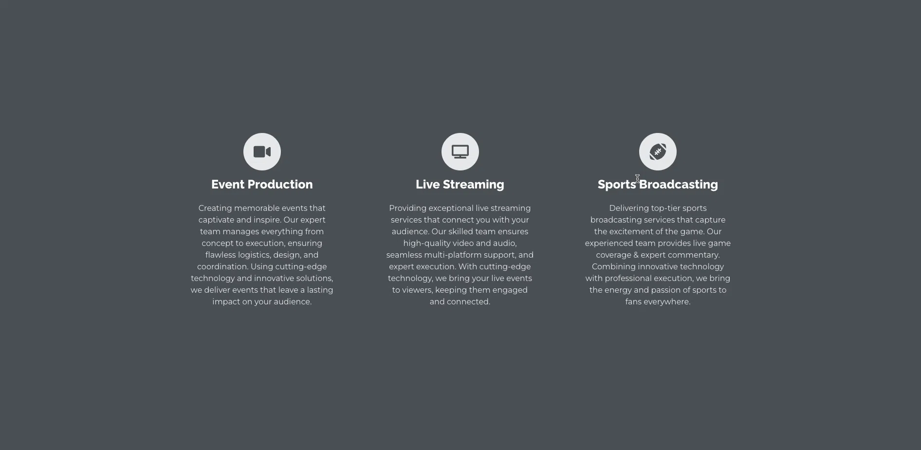 The services section showcases PanRight Productions’ three core strengths: event production, live streaming, and sports broadcasting. Designed with clarity and balance, this layout highlights their technical precision, creative execution, and commitment to delivering professional-grade results across every type of production.