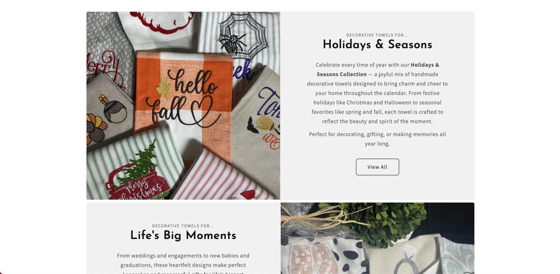 This section beautifully showcases Renee’s featured collections, allowing customers to explore by theme or occasion. Designed to reflect her creativity, it guides visitors from everyday moments to holiday celebrations. Each image and layout choice helps tell the story of handmade artistry and thoughtful design.