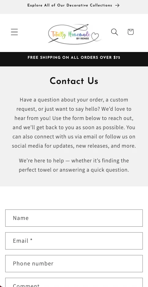 The contact page makes it effortless for customers to reach out with questions or custom requests. Built with clarity and warmth, it reflects Renee’s personal touch and commitment to great service. Whether shoppers need help or want to connect, this page ensures they feel heard and valued.