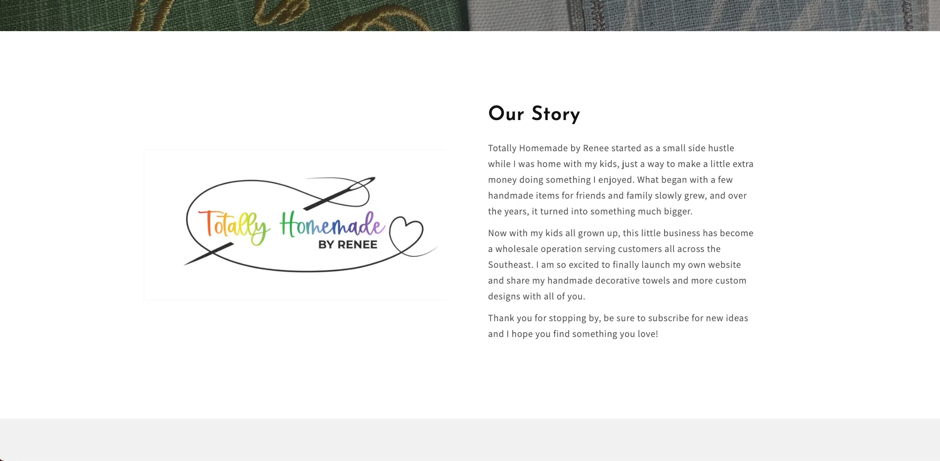 The homepage highlights the heart behind Totally Homemade by Renee, showcasing her handcrafted designs with a clean and inviting layout. This section welcomes visitors with warmth and personality, reflecting the care and creativity behind every piece while encouraging them to explore her collections.